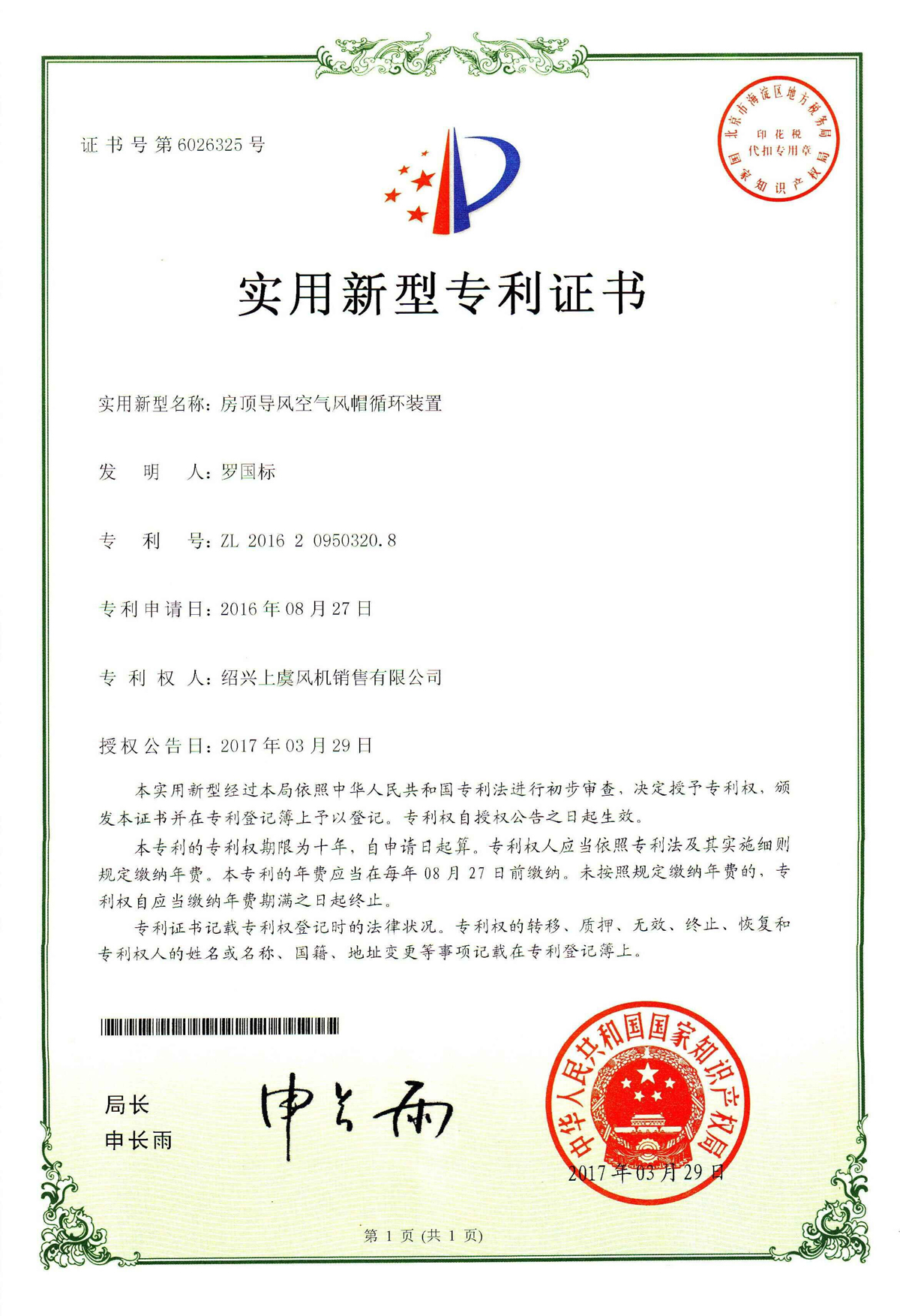| 房頂導(dǎo)風(fēng)空氣風(fēng)帽循環(huán)裝置專利證書 |
