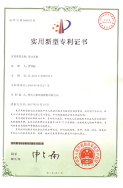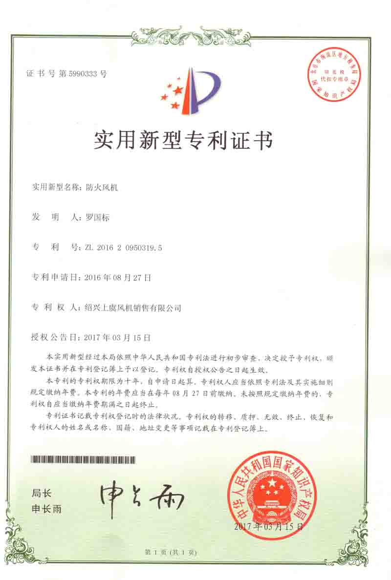 | 防火風(fēng)機專利證書 |